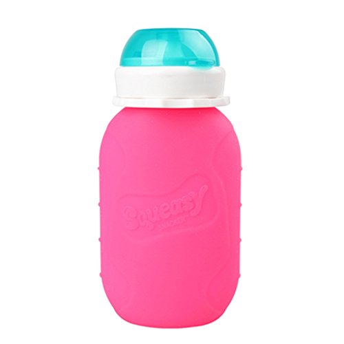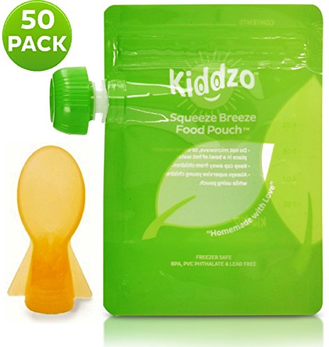 This pouch has a spout that is on the top of the pouch which makes it easier for younger babies to use. This pouch can hold up to 5 oz of food which is a pretty good serving for a baby and 7 fl oz will be good for a hungry toddler. These pouches are dishwasher and freezer safe which are both big pluses for very busy parents. These pouches are also BPV and PVC free which means that it is safe for your little ones to use. Other nice features with this pouch is that there is an area in the back that you can see through to see what flavor of baby food is in the pouch. Also there is a spot where the child’s name can be written in case you have multiple children and you want to keep track of who pouch it is. Easy to fill and easy to clean. The one downside is that over time and after many uses they do tend to wear out and have to be replaced.