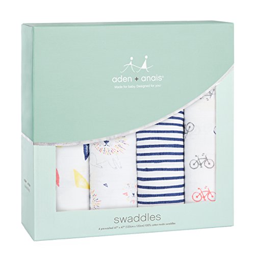 Currently, the one I recommend is the Classic Muslin Swaddle Blanket 4 Pack by aden + anais. This size is 47 x 47, made of cotton.